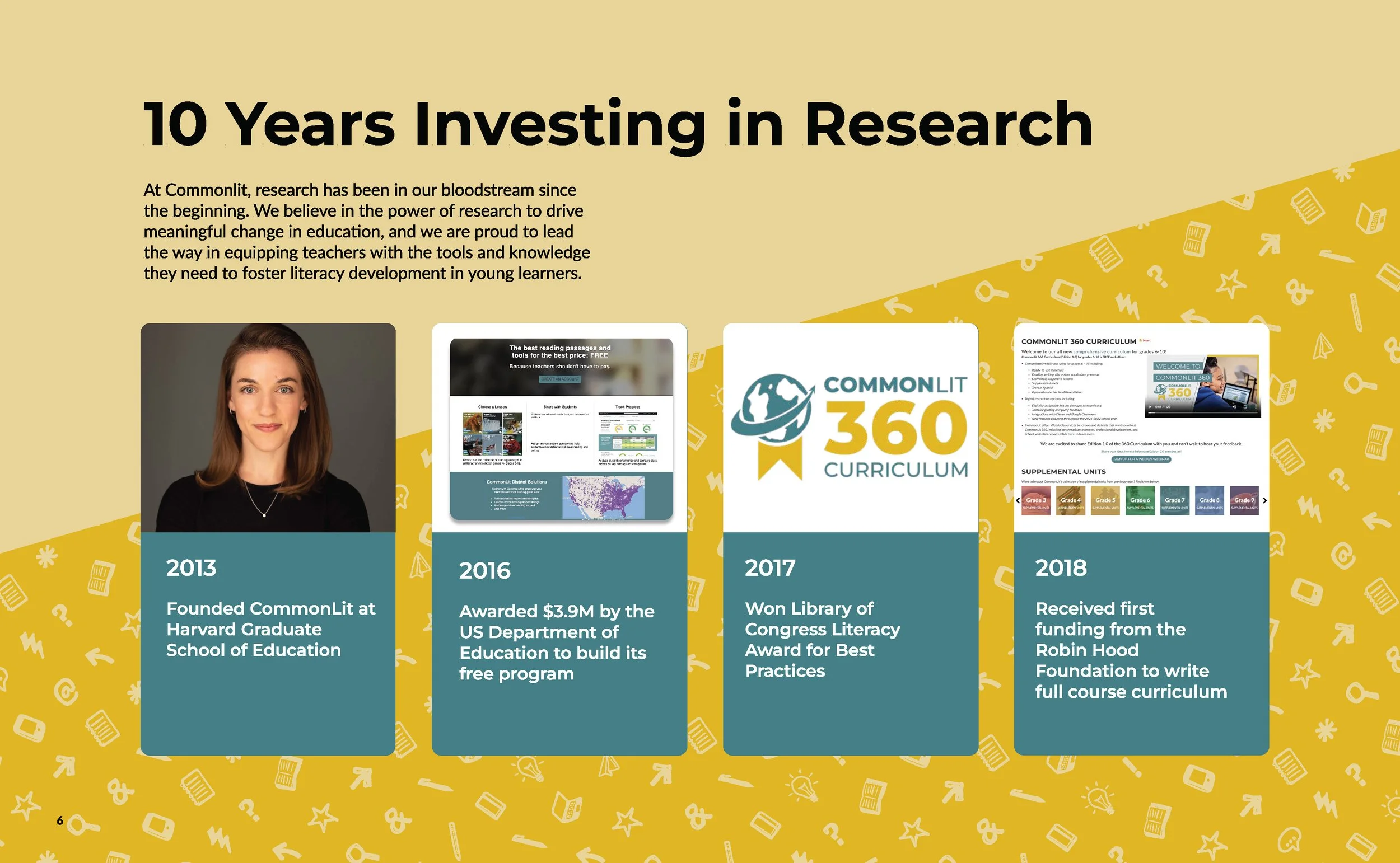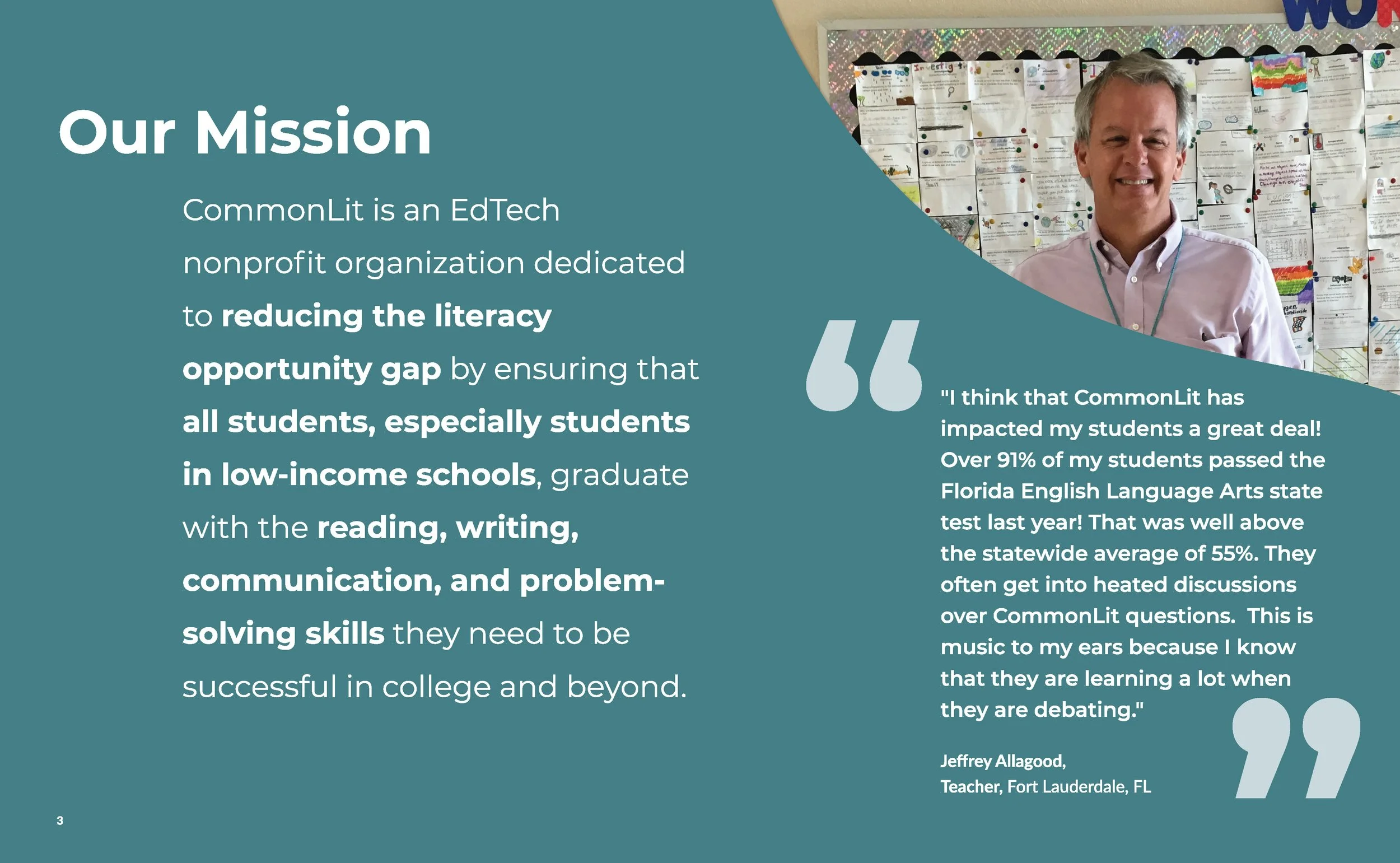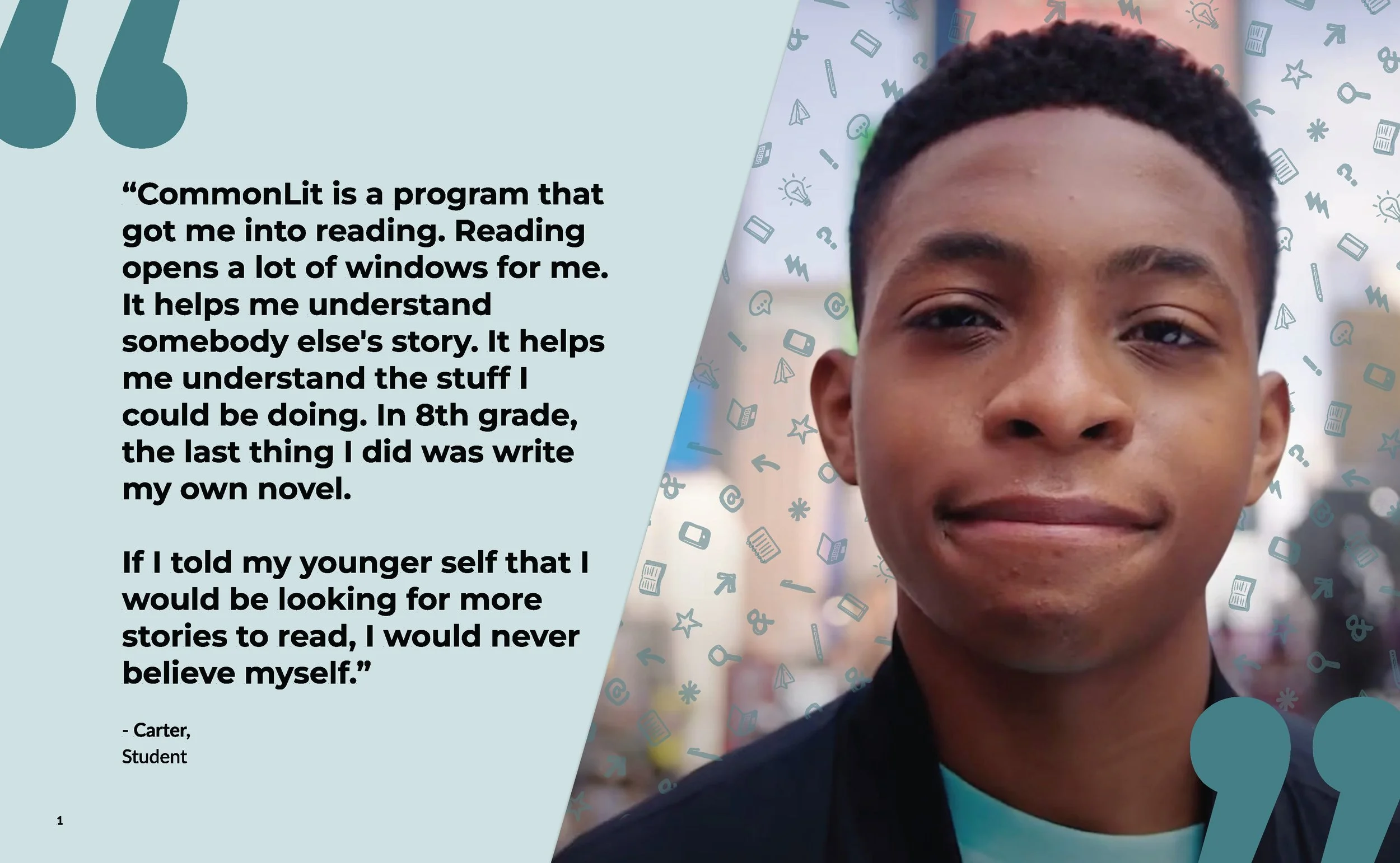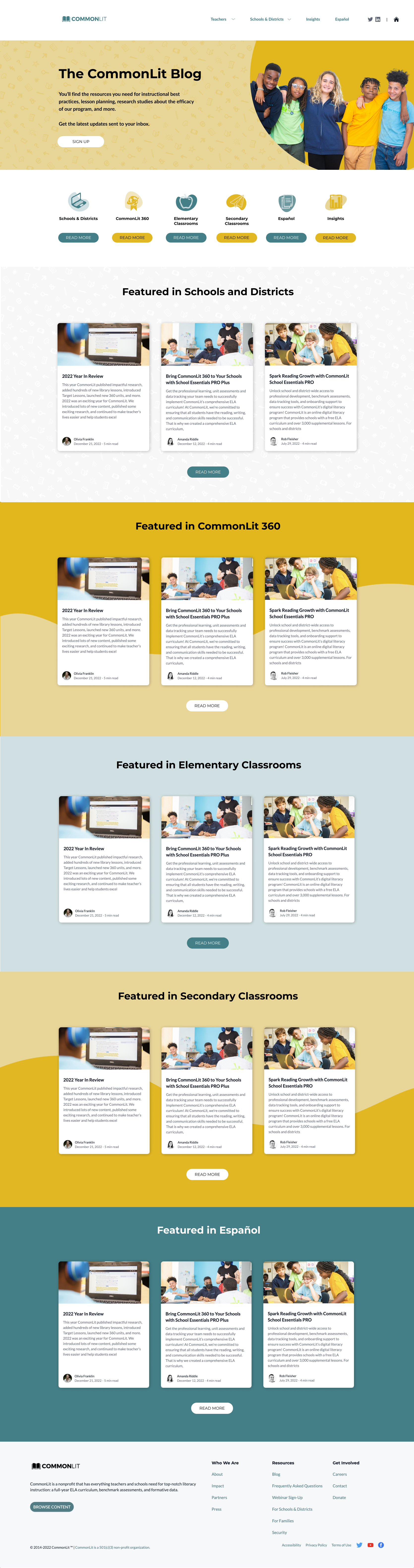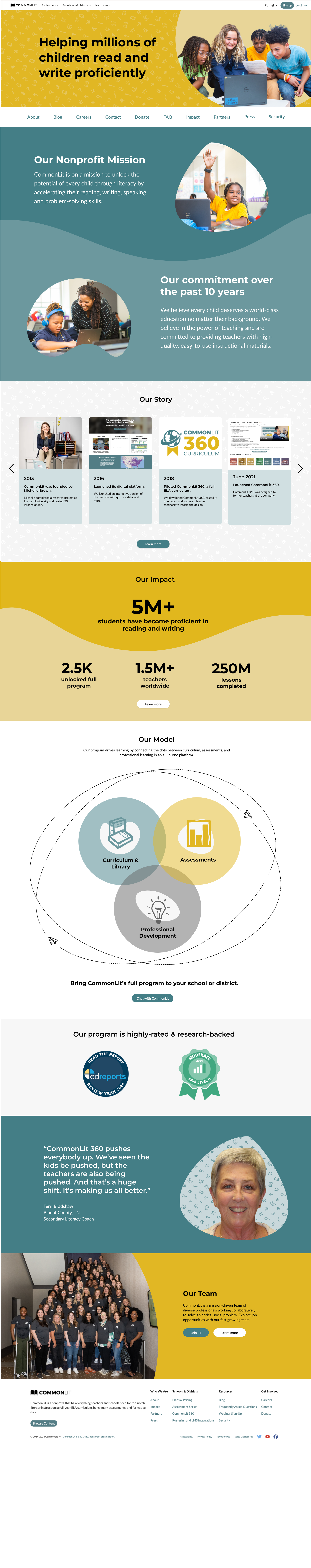 CommonLit wanted to appeal to educators and administrators searching for better online resources for their students and schools, while also marketing their online services and paid packages. To do this, I expanded on their existing brand identity, implemented a brand system more cohesively throughout their marketing materials, and remodeled their existing webpages. With a high-volume content-creating marketing team, I wanted to avoid encountering creative fatigue, so I designed a vast library of graphic elements for the marketing team to easily plug and play with to produce content. I then went on to apply this new branding to their social media templates, and website, designing over 20 individual webpages.