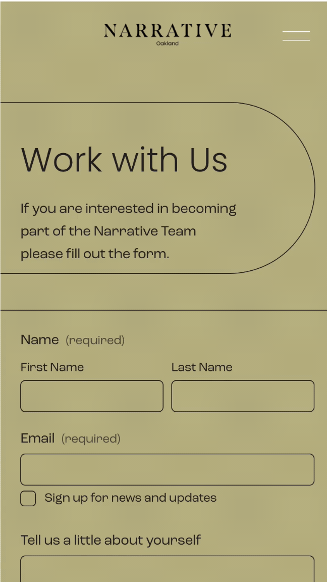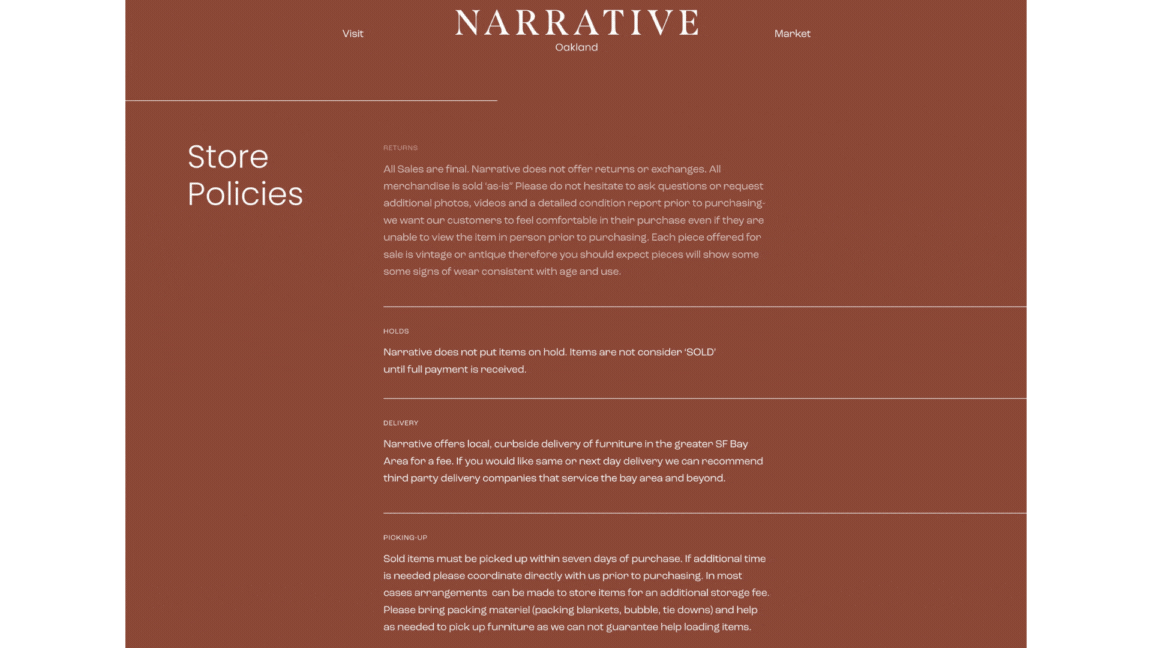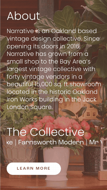 Narrative is a 14,000 sq ft shop in Jack London Square that hosts an expansive collective of a very curated group of vintage dealers. The goal of the website was to express the magnitude of the space and variety of the collective. I designed and implemented a bespoke website that reflected the collectors, and style of the space. I also made the artistic directive to have her space shot on film, for a more vintage, textured appearance specifically for the website.